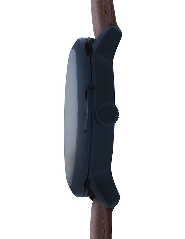 Caja: acero inoxidable con baño azul ionizado (43 mm diámetro, 12 mm grosor) Correa: piel marrón genuina (22 mm ancho) Cristal: mineral